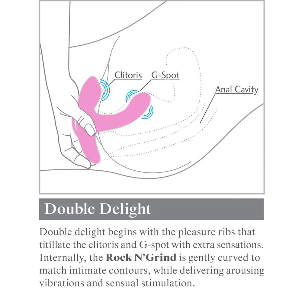 3Some is a premier collection for pleasure aficionados who crave excitement, fulfilment, and sexy self-indulgence. The 3Some collection puts the fun in function with clever intimate items that offer multiple ways to enjoy triple-decker sensations and three times the enjoyment!Double delight begins with the pleasure ribs that titillate the clitoris and G-spot with extra sensations. The Rock n Grind is gently curved to match intimate contours while delivering arousing vibrations and sensual stimulation.You’re in command! The positioning strap underneath allows you to control the rocking, grinding and movement.Multifunctional vibrator with pleasure ribs that titillate the clitoris and G-spot with extra sensations.Gently curved to match intimate contours, while delivering arousing vibrations and sensual stimulation.Two super-strong motors.7 Functions, 3 speeds.Can be controlled with or without the wireless remote.Rechargeable, USB charging cord included.Battery remote included.Splashproof.