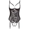 Beautiful design with ingenious insights!Sensual string body with adjustable and detachable suspender straps and a lightly padded shelf bra with a hook fastener at the back. With delicate strap details and elaborate rhinestones in the cleavage area.The semi-transparent lace inserts at the front allow lascivious insights. Above that, there are additional refined lacings with silver rings and stretchy straps. The crotch is completely open and features exciting strap details and rhinestones as well.90% polyester, 10% spandex, lace 90% polyamide, 10% spandex.