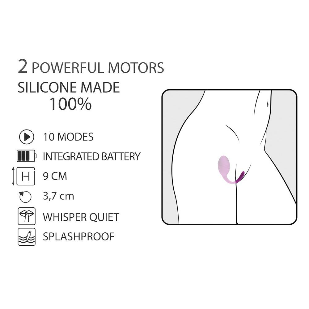 Wireless vibrating love egg with pleasureful clitoral vibrations and G Spot curveSmart Dream is a remote controlled vibrating egg with the external clitoral stimulator, it has a hypoallergenic texture and offers dual stimulation, internally and externally for the clitoris. The Smart Dream egg is made from a soft silicone material and has a great silky smooth touch. This special vibrating egg creates great stimulation which targets erogenous zones. Equipped with two powerful and quiet motors it will delight the most demanding users.It can also be used as a couple’s toy, the thin arm can be inserted with the penis, while the vibro bullet pleasures the clitoris.