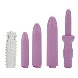 Enhance your enjoyment of sex and expand your pleasure principle with this dilator set, created to assist women who struggle with discomfort during intercourse, have sexual anxiety, or simply want to work on strengthening their pelvic floor. The three graduated sleeves allow you to progress gently at your own pace Soft silicone sleeve with rows of pleasure nubs enhances your internal sensations Provides powerful, multispeed vibrations Trains your vaginal muscles and pelvic floor to increase pleasure in your sex life Designer pouch included