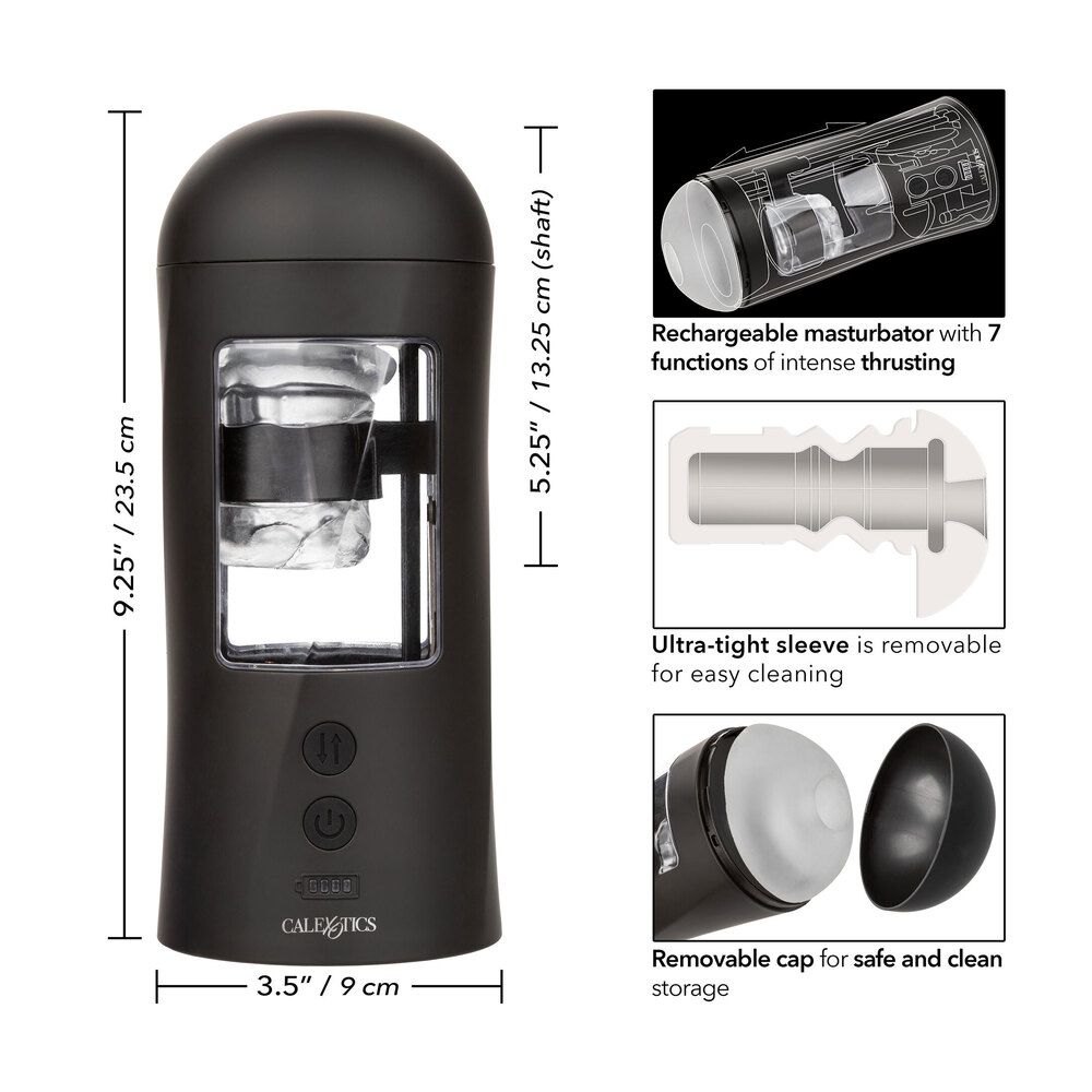 Wrap yourself in state-of-the-art pleasure with the powerful Bionic Power Stroking Masturbator. This totally self-contained thrusting masturbator was made to envelop the senses with a fully customizable stroking experience.An ultra-tight textured chamber wraps tightly around you, while 7 functions of intense thrusting action deliver unparalleled pleasure with every stroke. No matter how hot and heavy things get, the easy-touch control pad makes it easy to adjust functions and turn the stroker on or off.An ultra-tight, ultra-soft life-like sleeve can be removed for cleaning or used independently from the stroker. Take your pleasure to go with the removable cap for safe, clean storage. Indulge in over 60 minutes of low-speed stroking pleasure and recharge your passion in only 5 hours with the provided USB cable.7 functions of intense thrusting actionSelf-contained wireless designUltra-tight and the life-like sleeve is removable for easy cleaningRemovable cap for safe and clean storageState-of-the-art memory chip resumes on the last function usedSecurity travel lock feature hold for 3 seconds to turn on (with instant off)USB rechargeable charging cord includedComplete charge in 5 hoursRuns for 45 minutes on high speed and 60 minutes on low speed
