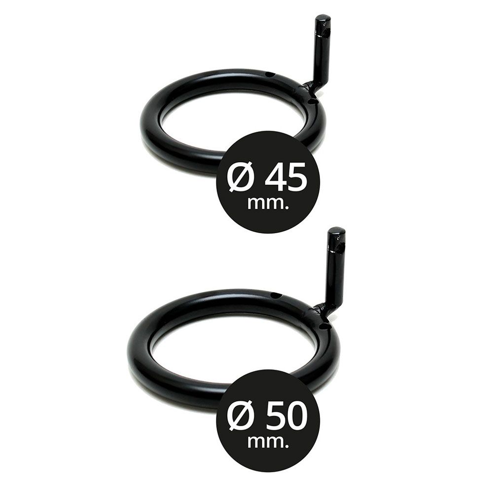 This chastity device is a two piece cock and ball restraint made out of metal. A cock ring that fits behind the balls and a wire cage that encloses and contains the cock. The cage is applied by placing the testicles through the ring so that it fits behind them. Then the cock is placed inside the wire cage. Two pins connect the cage to the ring. The larger pin has a hole to place the lock, which is included with the kit. The cage features holes for urination. Pulling on the cage section will tend to stretch the testicles.Contains, 1 padlock with 2 keys and two different sized rings, 45mm and 50mm.