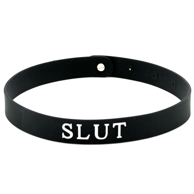 Black silicone adjustable collor.The word SLUT is wrote on the front of the collor in white letters.