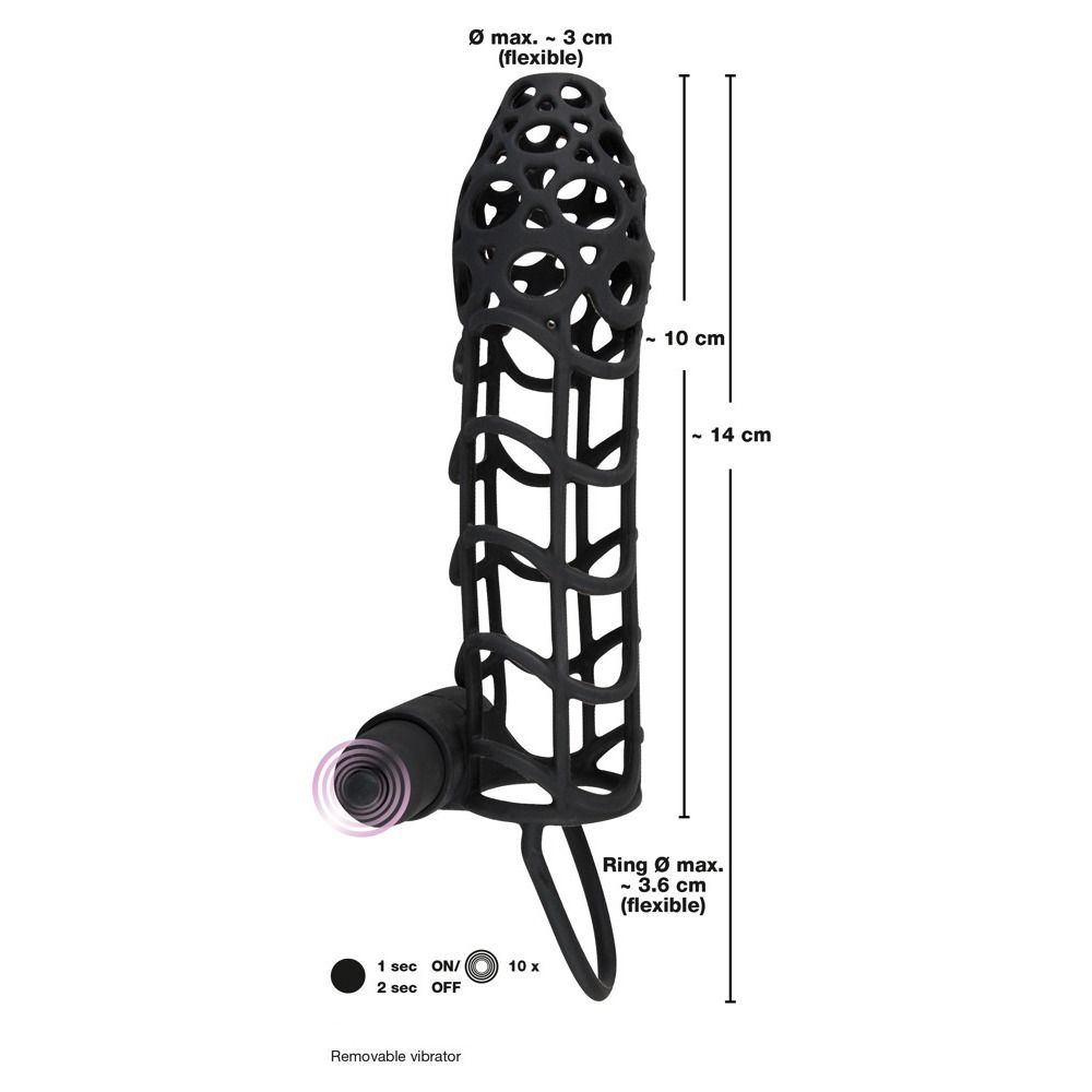 For magnificent erections!Make your best asset the centre of attention with this black, velvety soft penis sleeve with a fascinating lattice pattern and testicle ring. The mini vibrator, that can be integrated, with 10 vibration levels at the touch of a button provides an extra kick.