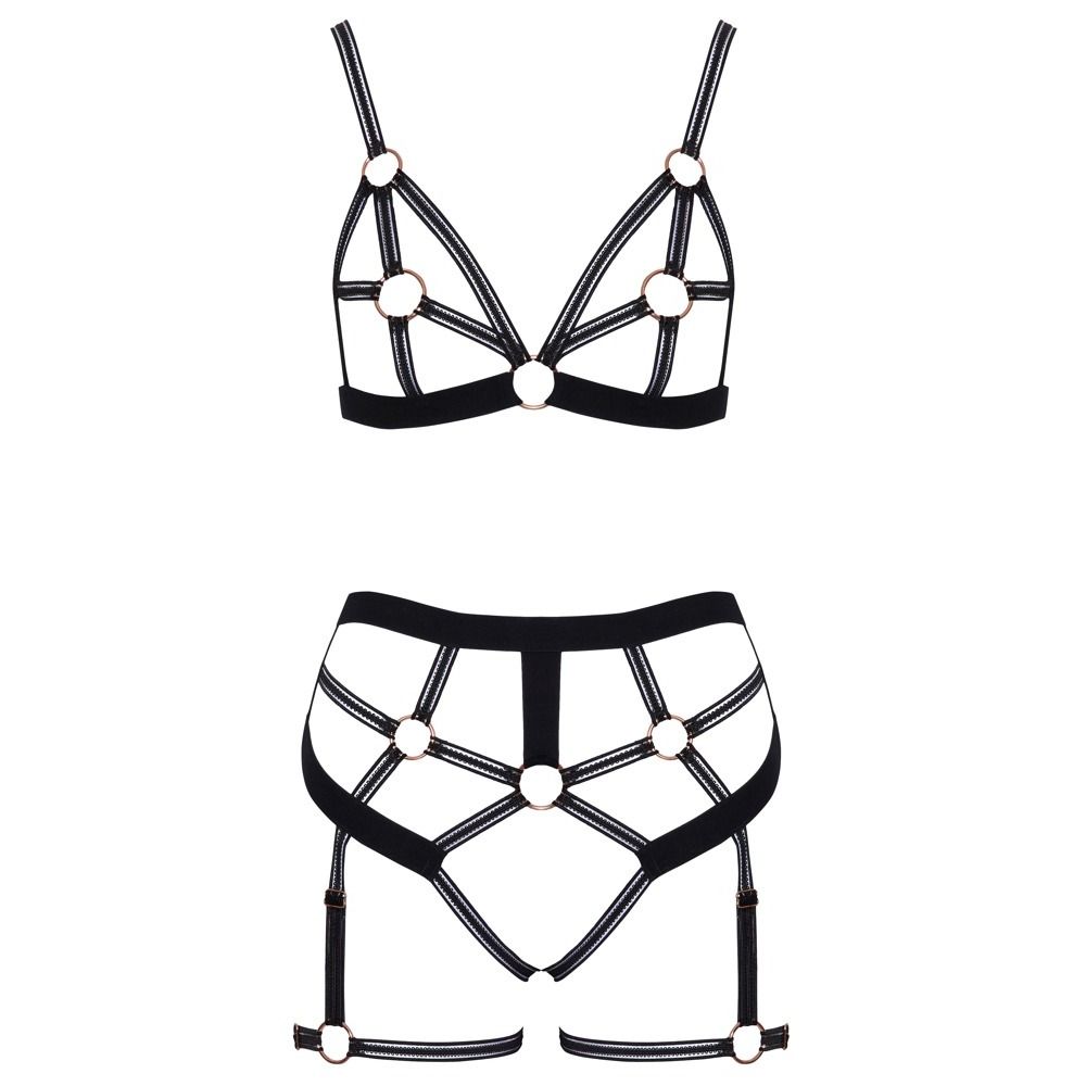 Ouvert set with a bra and waist-high thongHarness style with stretch bands and ringsThong with thigh strapsAdjustable suspenders without clipsAdjustable bra strapsCrotchless thongSoft and stretchy for high comfortProvocative yet comfortable harness look!