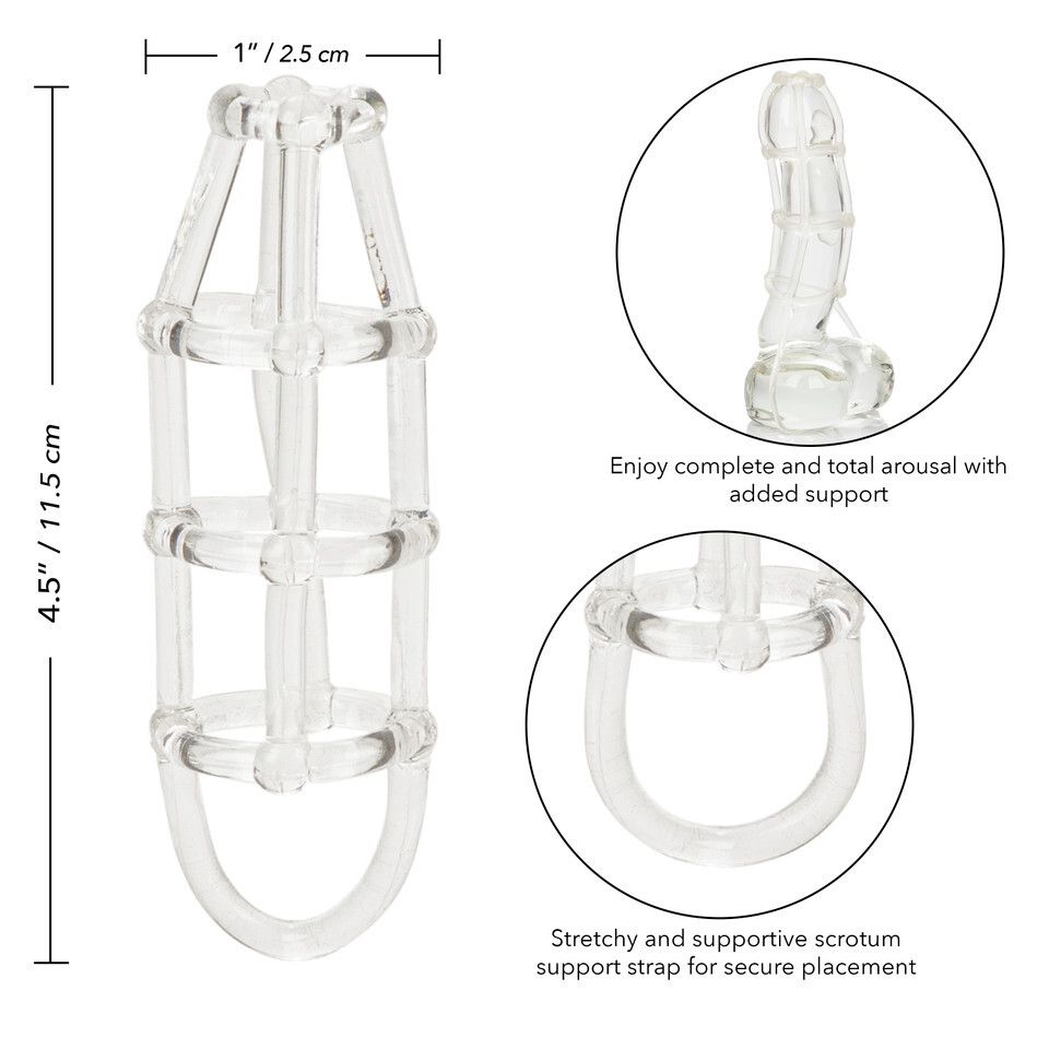 Enhance and elevate your sensual performance with the erotic Cock Cage Enhancer. The ultra stretchy cage design provides erection support and enhancement for maximized pleasure and ultimate intense orgasms. The easy to use erection enhancer is suitable for any man who wants to prolong the fun and extend ecstasy.The Cock Cage Enhancer is made from super stretchy, unscented phthalate-free TPR and is soft, pliable and comfortable to wear. To use, slip the cage over the erect penis and secure the base strap around the scrotum, for increased performance support. The cage also provides enhancement along the entire length of the shaft for mutual arousal satisfaction.The easy to use Cock Cage Enhancer is great for spontaneous indulgent exploration and makes a great addition to an exotic toy collection. Use the sturdy, supportive cage when exploring your secret fantasies and red-hot desires. Enhanced sensations are yours to enjoy and share with your lover. To increase sensitivity, and to extend the play, it is recommended that you use a water-based lube with this toy. Before and after every use, clean the stretchy cage in warm soapy water, or with a toy cleaner spray.