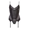 Black Basque with decorative lacing and rhinestone jewel, back closes with hook and eye. All straps adjustable, g string included. Stockings not included
