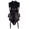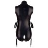 A strict dominant look, soft comfortable material!A stretchy body in a matte black look with metal details and suspender straps. With zips over the breasts and decorative studs at the front. There are also arm loops with hook and loop fasteners at either side of the body and a zip at the back. There is a 2-way zip over the crotch. The suspender straps are adjustable and removable. 90% polyester, 10% spandex.