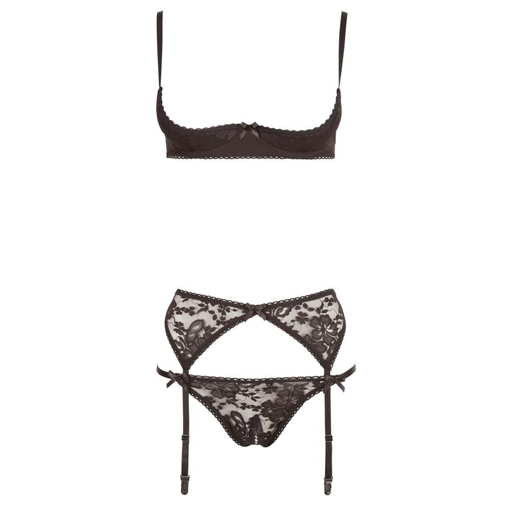 Half cup bra, rio string ouvert and suspender belt in a set. All three items are made of black lace. Half cup bra with slightly padded cup, rio string with open crotch. 90 percent polyamide, 10 percent spandex. Without stockings.