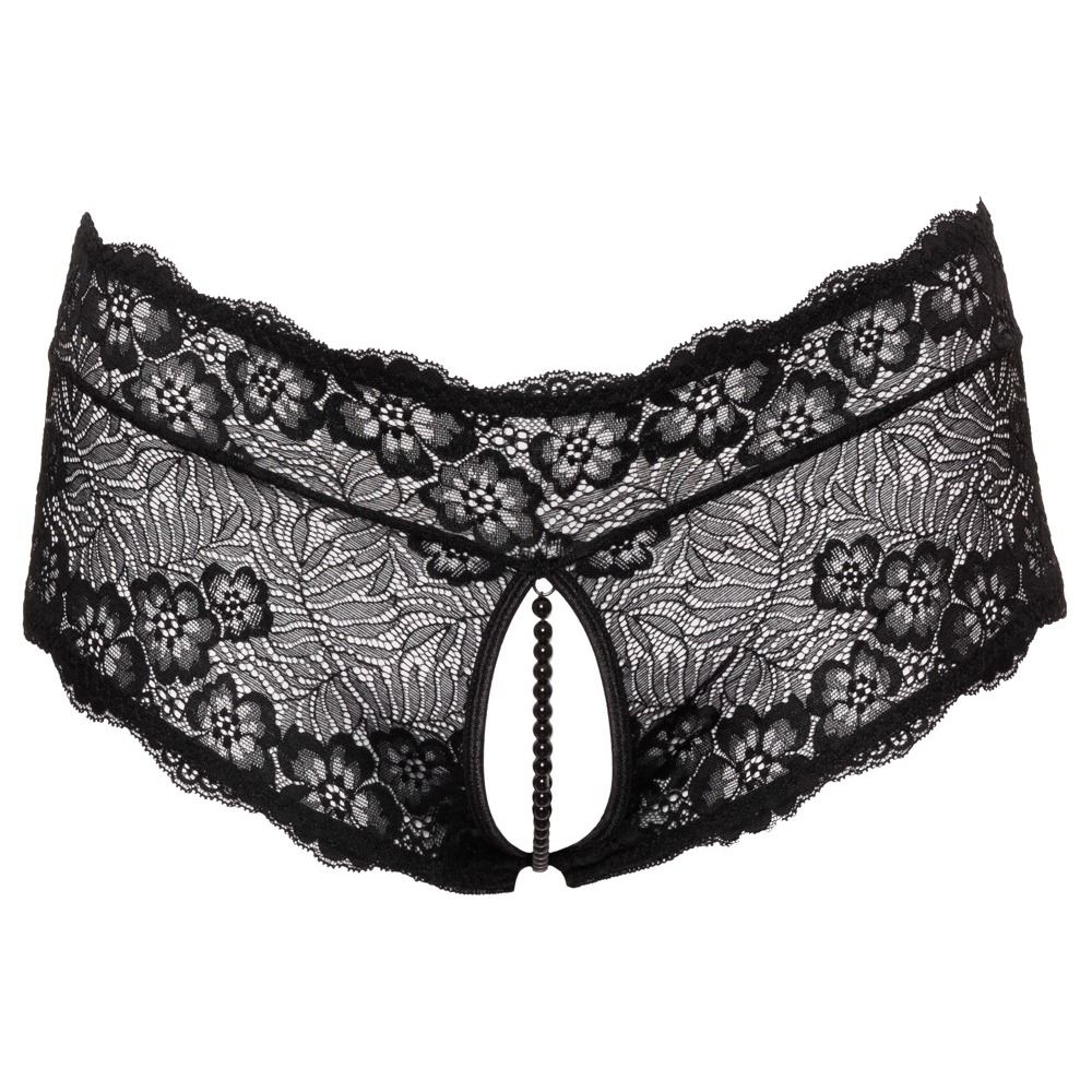 Crotchless panties made of delicate floral laceInvitingly open at the crotchWith a stimulating pearl chain at the crotchSatin lacing at the bottom cut-outSoft and stretchy for high comfortDelicate lace with seductive details!Black, crotchless panties from Cottelli CURVES are made entirely out of delicate floral lace. Soft and stretchy for a perfect fit and high comfort. The elastic and stimulating pearl chain in the open crotch is especially ingenious, as well as the satin lacing in the triangular cut-out at the bottom.90% polyamide, 10% spandex.