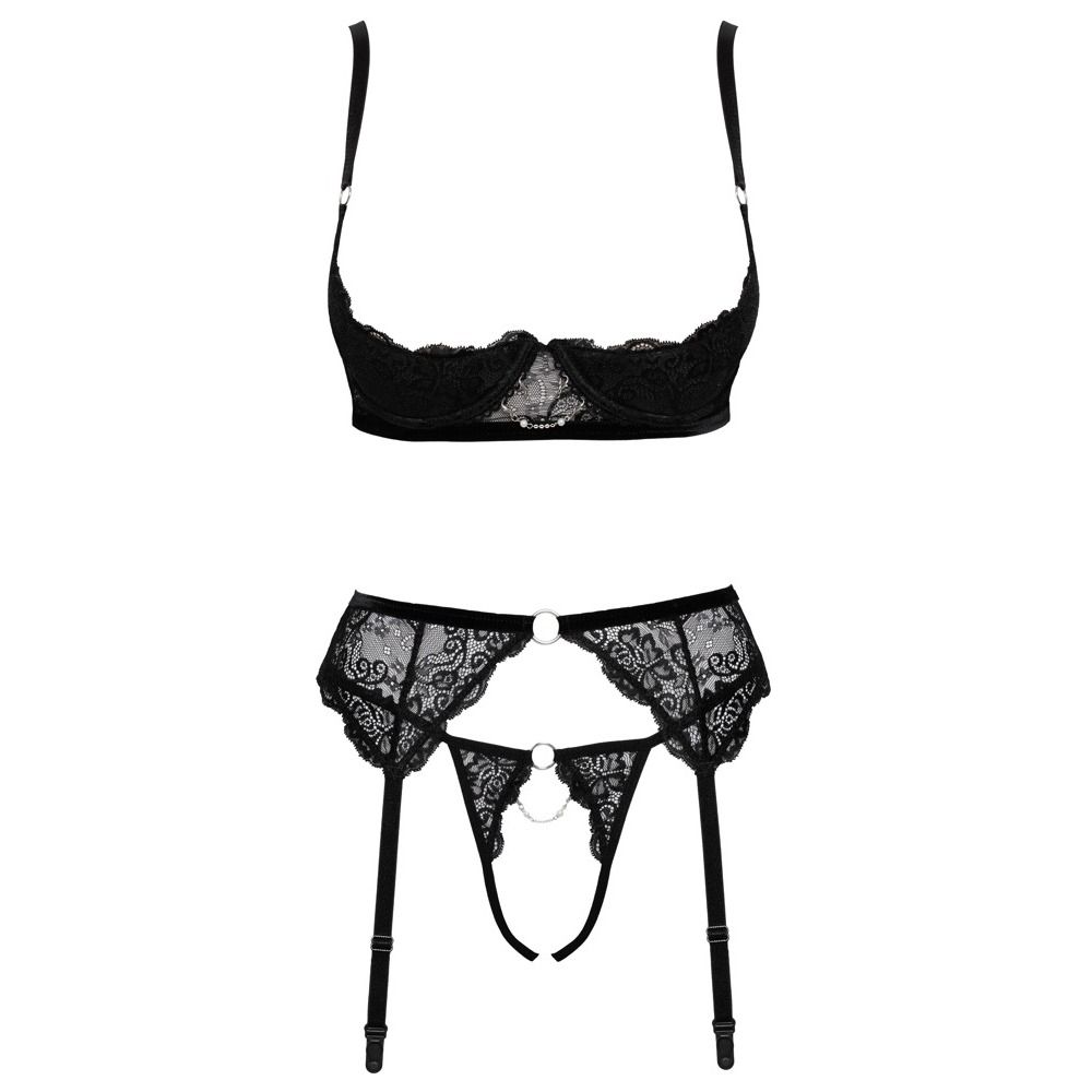 Shelf bra, suspender belt and crotchless thong combined in a set from Cottelli LINGERIE. All are made from soft black stretch lace and decorated with silver-coloured rings and elegant velvet details. Decorated with chains and beads between the cups and the front of the crotchless thong, all of which are removable. The lightly lined underwired cups show off the breasts in an exciting way. The straps and hook fastening at the back can be adjusted to fit. Waist suspender belt with adjustable suspender straps and hook fastener at the back. The small lace thong seduces with its completely open crotch and small bow over the bum.Shelf bra, suspender belt and crotchless thong in a setDelicate lace with velvet detailsRemovable decorative chainsSilver-coloured ringsShelf bra with lightly padded underwire cupsInviting crotchless thongAdjustable straps and suspendersSoft and stretchy for high comfortElegant, erotic trio with lots of jewel details!90% polyamide, 10% spandex.Supplied without stockings.
