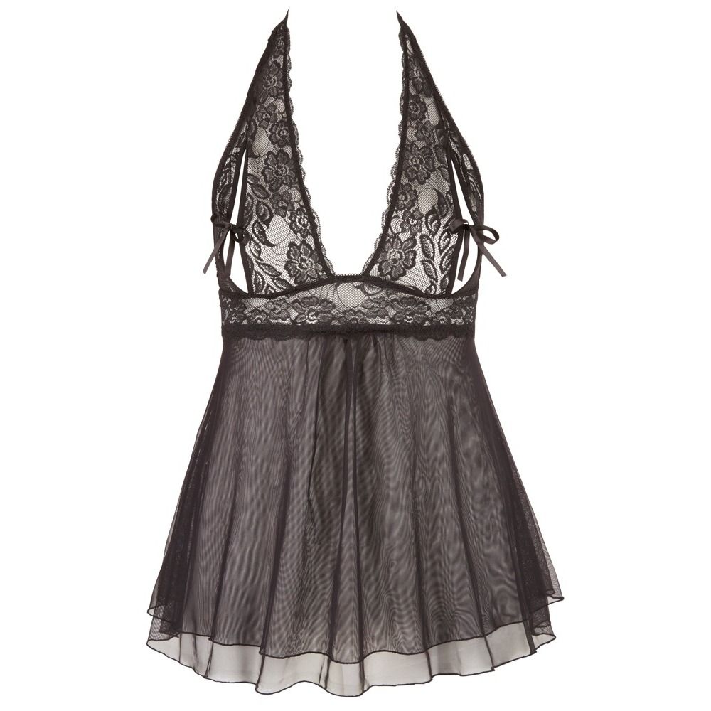 This black babydoll with a halterneck and hook fastener in the back scores with slit cups that highlight the breasts and are closed with a small bow, while the double-layered skirt with its flared shape cleverly plays around the hips. A real laundry dream!