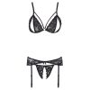 3-piece suspender set with seductive floral lace. The bra has adjustable straps, a captivating strap design in the cleavage area and cups with cheeky slits accentuated by a small decorative ring. The included suspender belt is narrowly cut and has adjustable suspender straps. Both lingerie pieces have a clip fastener at the back for easy on and off. The completely crotchless string adds the finishing touch to this ensemble.