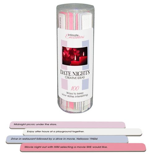 100 ways to keep your dates interesting! Whenever you need a date night idea, select an idea stick. Read both sides of the stick with your significant other and choose the one you wish to carry out. Note, You may wish to display these sticks in a decorative bowl or on a plate. Includes: 50 sticks with 100 creative ideas.