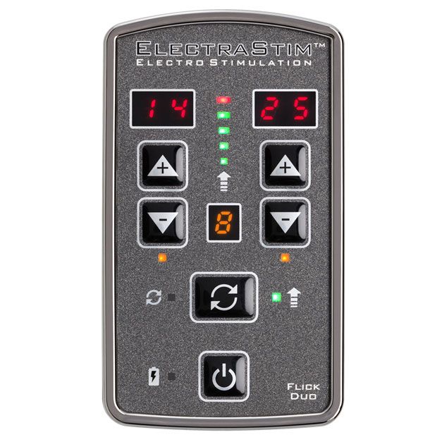 The ElectraStim Flick Duo is the worlds first rechargeable electro sex machine with 2 independent channels. Ideal for couples and power players who want to use more toys at the same time, Flick Duo can power up to 4 uni polar or 2 bi polar electrodes at once. Each channel is controlled independently, giving you more control over the sensations you feel and improving shared stimulation with your partner. With 8 pattern settings and 4 motion activated Flick settings to explore over 25 intensity levels, you will be spoiled for choice as you explore the titillating charms of this innovative stimulator. Small in size and big on function, you will love the sleek look and feel of this intuitive electostimultion device. We have included everything you need to get started, including 4 of our best selling ElectraPads so you are ready to play straight from the box.