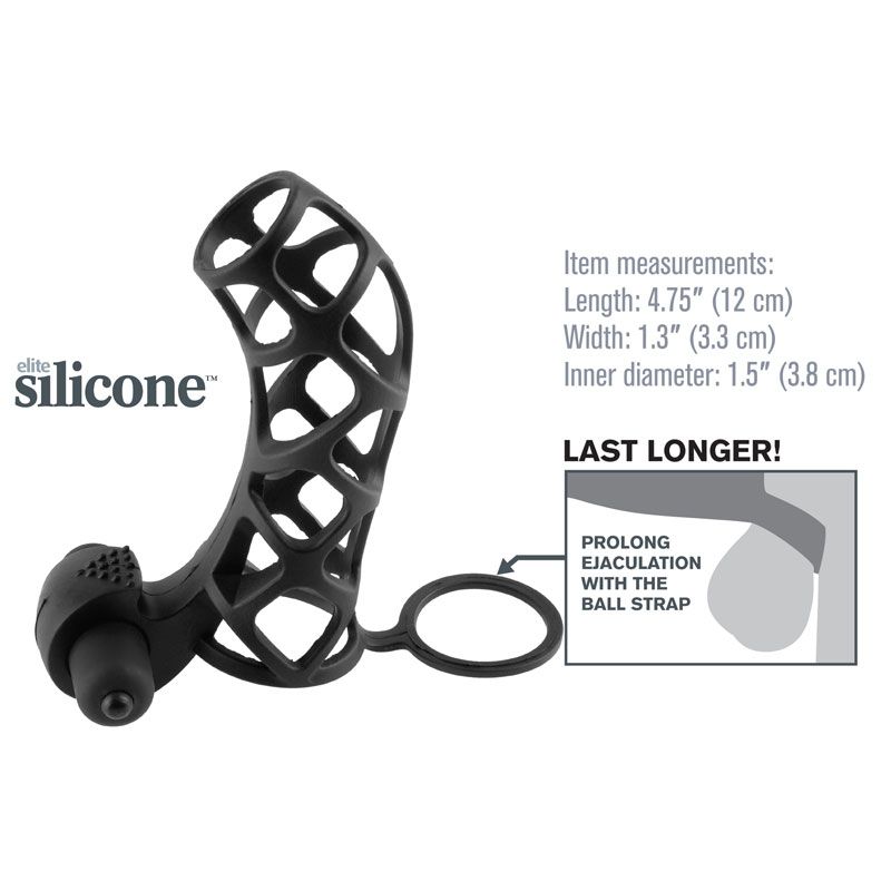 Turn your penis into an instant pleasure machine with the incredible Fantasy X-tensions. Now you can be all the man you can be and satisfy your partner with this easy to use erection enhancer. Developed as a safe, affordable, non-surgical alternative to expensive medical procedures and pills, your Fantasy X-tension will give you the biggest, thickest, most satisfying pleasure rod you ever imagined! Perfect for men with ED and midway performance problems, your new enhancer will deliver results that both partners will love!The Extreme Silicone Power Cage is the ultimate erection enhancer! With this cock cage wrapped snug around every inch of your manhood, you’ll maintain rock hard erections and prolong the fun while you stimulate your partner. The ball strap prolongs ejaculation for explosive climaxes, while the cage leaves your cock open to feel every sensation and still enjoy the natural touch of your lover. You’ll enjoy thick, throbbing erections and your partner will love the cage’s added sensations. The vibrating clit stimulator delivers direct stimulation to their most sensitive spot. Just one click of the powerful waterproof micro vibe and you’ll make them cum harder than ever before!Cleanup is a snap after the fun with toy cleaner and warm water. One size fits most. This is not a condom. The Ultimate Couples Erection Enhancer Hygienic Elite Silicone Cage Provides Extra Sensations Powerful Vibrating Clitoral Stimulator Prolongs the Fun as a Cockring Phthalate Free Item measurements Length 4.75 inchesWidth 1.3 inchesInner diameter 1.5 inches