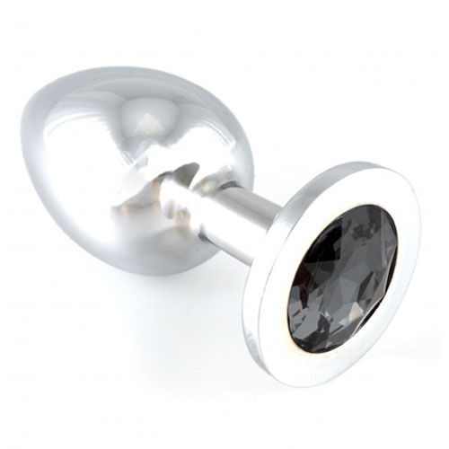 Large heavy smooth aluminium butt plug with a black crystal at the base to accentuate the bottom. Comes in a black presentation box.
