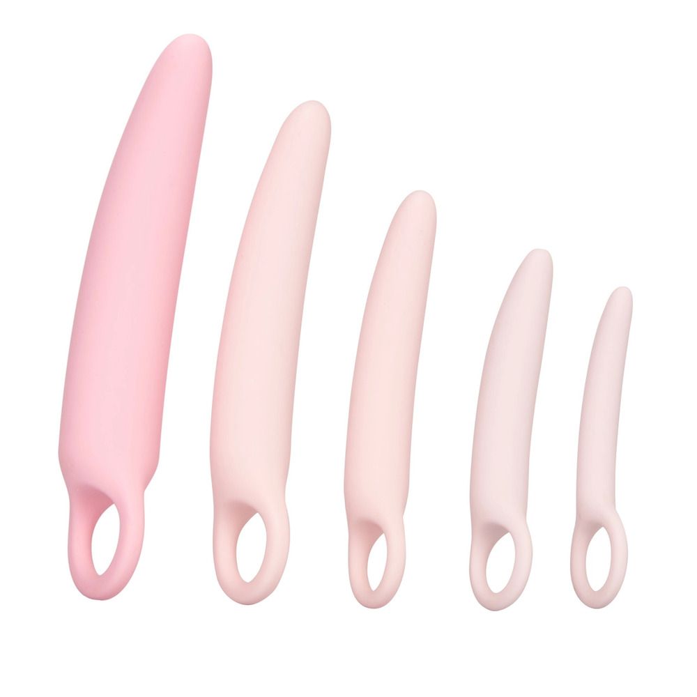 The dilator set may restore and revive vaginal strength and comfort. It is a 5 piece kit for gradual dilation, that is ergonomically curved for ease of use. There is an easy to use finger loop or may be used with massager not included and they are 100 per cent Silicone