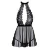 Short, flared babydoll from kissable made of beautiful, transparent, black lace and delicate powernet. It is velvety soft and stretchy for a comfortable fit. The backless babydoll has a large cut-out in the cleavage area. The satin collar can be tied together at the back of the neck, the satin waist strap can be tied together at the back. The matching small string is included.Babydoll and string in an exclusive setLace and powernet in a delicate mix of materialsLarge cut-out at the frontOpen back satin collar that can be tied togetherThe satin waist strap can be tied together at the backSoft and stretchy for a comfortable fitElegant seduction in an exclusive style!Powernet 95% polyester, 5% spandex lace 90% polyamide, 10% spandex.