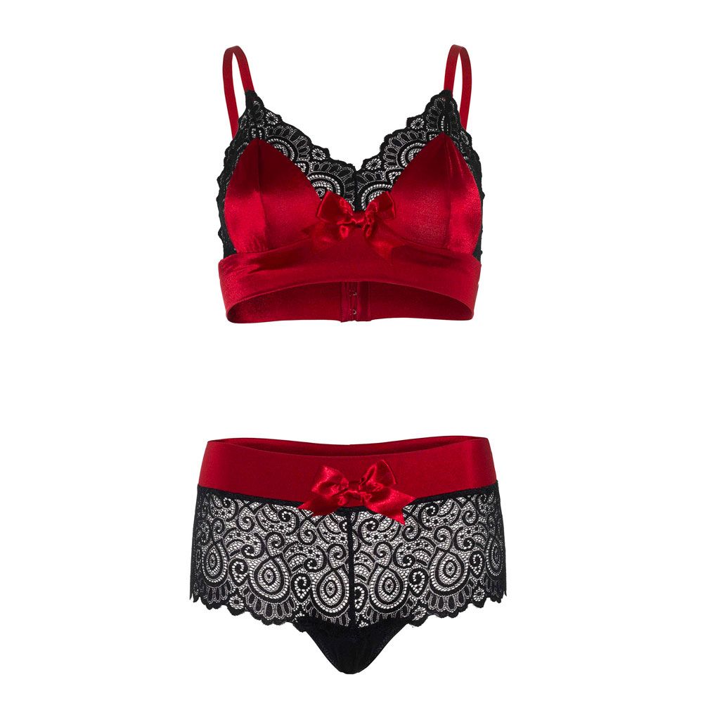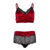 2 PC. Supersoft lace trimmed satin spandex bralette with hook and eye closure, adjustable straps and matching boyshorts with cotton gusset.