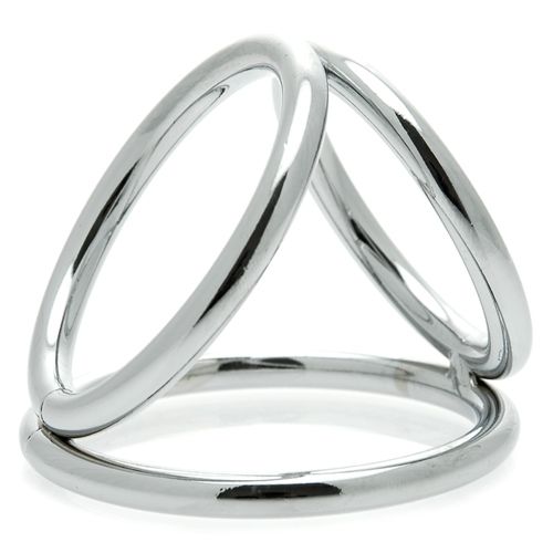 The Triad Chamber brings the art of domination in threes. This chrome cock cage features three differently sized O rings with which you can ensnare your pet. The largest ring goes around the cock and balls like a normal cock ring. The middle sized ring goes around the balls, providing the wearer with a pressure sensation. The third ring goes around the base of the penis to help you maintain the kind of erection that lasts for extended sessions. The Triad Chamber is perfect for the experienced user who wants a sleek and modern look, but seeks a weighted, more supportive cock ring. MeasurementsSize LargeFirst Ring 1.5 Inches Diameter 4.75 Inches CircumferenceSecond Ring 1.75 Inches Diameter 5.2 Inches CircumferenceThird Ring 2 Inches Diameter 6 Inches Circumference