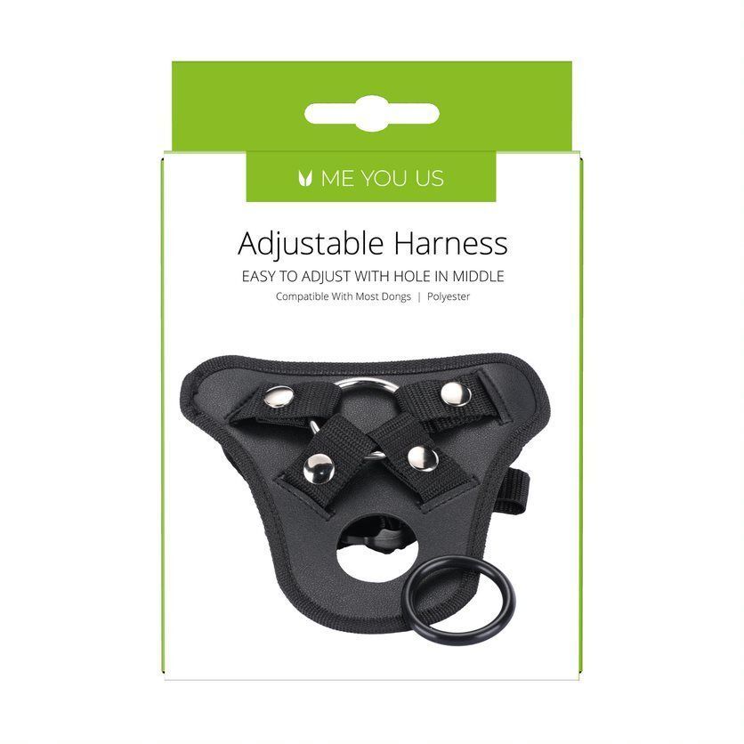 Me You Us Black Adjustable Harness, easy to adjust with a hole in the middleThe harness can be used with most dildos with a flat or tapered base for further flexibility, and can be used by both men and women.The harness is made from PolyesterRing1-diameter 4.6cmRing2-diameter 3.6cmHole-diameter 4.6cm