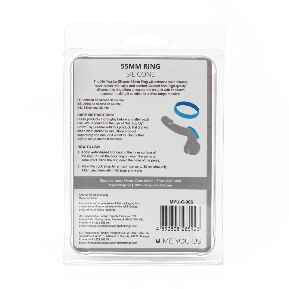 The Me You Us Silicone 55mm Ring will enhance your intimate experiences with style and comfort. Crafted from high-quality silicone, this ring offers a secure and snug fit with its 55mm diameter, making it suitable for a wide range of users.The sleek and minimalist design of this ring is a testament to its discreet functionality. It effortlessly conforms to the body and is easy to wear, making it an excellent choice for both beginners and experienced users. The silicone material is body-safe, hypoallergenic, and easy to clean, perfect for repeat use. Whether you’re looking to prolong your erections, intensify sensations, or experiment with elevated experiences, the Me You Us Silicone 55mm Ring is a versatile choice that can elevate your intimate moments. Discover a new level of pleasure and satisfaction with the Me You Us Silicone 55mm Ring and enjoy enhanced performance in the bedroom.Inner diameter 55mmOuter diameter 69mmThickness 7mmHeight 14mm