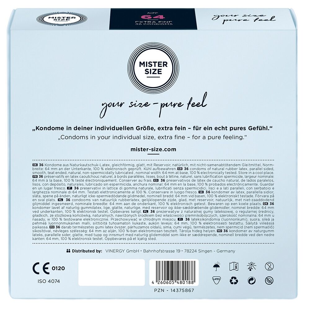 MISTER SIZE is the ideal companion for your sensitive, elegant penis. Working together you will create wonderful moments of great ecstasy. You really don’t need a mighty beast to fully enjoy the moment or move mountains, just the right feel for those intimate touches that send shivers of pleasure running through your body. MISTER SIZE gives you protection without wasting a single tinge of feeling.More feeling with your personal condom sizeThanks to MISTER SIZE, condom problems are a thing of the past. Once you have found your own ideal size and everything fits perfectly, you can once again experience the pure skin-on-skin feeling of sex, let go and lose yourselves in each other.MISTER SIZE 7 Condom Sizes for Better SexYou can get our MISTER SIZE condoms in seven different sizes, ranging from 47 mm to 69 mm.MISTER SIZE comes in 3 Packet SizesTo ensure you are always sufficiently stocked, MISTER SIZE condoms are available in three different packet sizes3 pieces – to try out in the field10 pieces – for your following nights of love36 pieces – a stockpile for optimists and smart shoppersOf course, you can order as many packs as you like, depending on how you are going to spend the next weeks and months.Proven QualityMISTER SIZE gives you a whole new feeling during sex while at the same time offering optimal safety. All our MISTER SIZE condoms comply with the DIN standard EN ISO 4074 2002 and are subject to careful testing. Having a condom with optimal safety breeds confidence and certainty which allows you both to totally relax and let go during love-making.