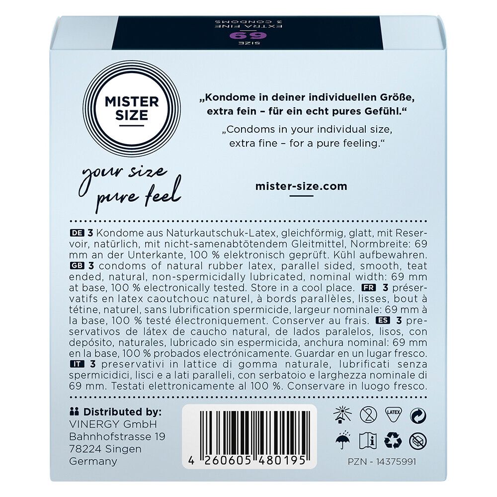 MISTER SIZE is the ideal companion for your sensitive, elegant penis. Working together you will create wonderful moments of great ecstasy. You really don’t need a mighty beast to fully enjoy the moment or move mountains, just the right feel for those intimate touches that send shivers of pleasure running through your body. MISTER SIZE gives you protection without wasting a single tinge of feeling.More feeling with your personal condom sizeThanks to MISTER SIZE, condom problems are a thing of the past. Once you have found your own ideal size and everything fits perfectly, you can once again experience the pure skin-on-skin feeling of sex, let go and lose yourselves in each other.MISTER SIZE 7 Condom Sizes for Better SexYou can get our MISTER SIZE condoms in seven different sizes, ranging from 47 mm to 69 mm.MISTER SIZE comes in 3 Packet SizesTo ensure you are always sufficiently stocked, MISTER SIZE condoms are available in three different packet sizes3 pieces – to try out in the field10 pieces – for your following nights of love36 pieces – a stockpile for optimists and smart shoppersOf course, you can order as many packs as you like, depending on how you are going to spend the next weeks and months.Proven QualityMISTER SIZE gives you a whole new feeling during sex while at the same time offering optimal safety. All our MISTER SIZE condoms comply with the DIN standard EN ISO 4074 2002 and are subject to careful testing. Having a condom with optimal safety breeds confidence and certainty which allows you both to totally relax and let go during love-making.