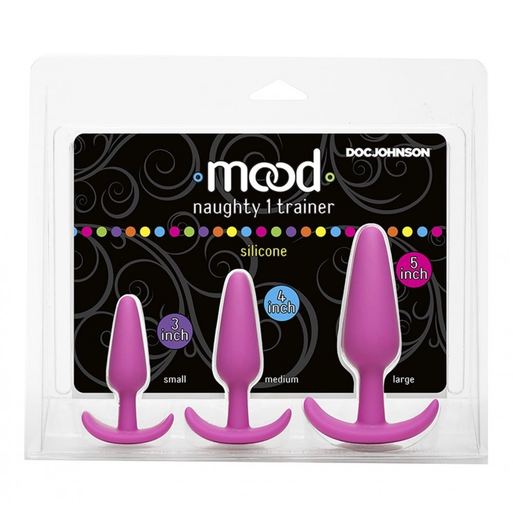 How naughty do you want it? The Mood Naughty 1 Trainer Set in premium silicone includes our bestselling original Mood Naughty butt plug in three graduated sizes. Measuring at 3, 4, and 5 inches, this set is perfectly shaped and sized to help backdoor beginners gently expand the boundaries of their anal experience. The classically tapered tip of Mood Naughty slides right in, and the firm yet flexible material and curved rocker base make these plugs comfortable and safe for extended wear.3 inches, 4 inches, and 5 inches Sizes for Training and Variety. Firm, Flexible Silicone. Tapered Tip for Easy Insertion. Curved Base for Comfortable Wear. Soft, Velvet Touch Finish. Phthalate-Free, Body-Safe.
