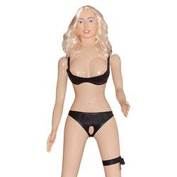 Blonde love doll with elaborately formed hands and feet. Including a pump for fast inflation, talcum powder and rose pink carriage bag.