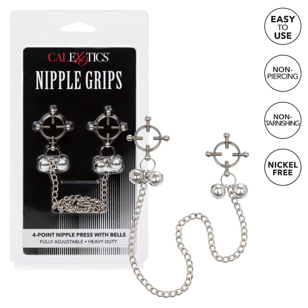 Add some fun to your sex life with the Nipple Grips 4-Point Nipple Press with Bells. Heighten your nipple play with a simple twist of the screws. Tighten the screws to exactly the pressure you desire, and pull on the chain for a satisfying tugging sensation with the bells ringing with pleasure.