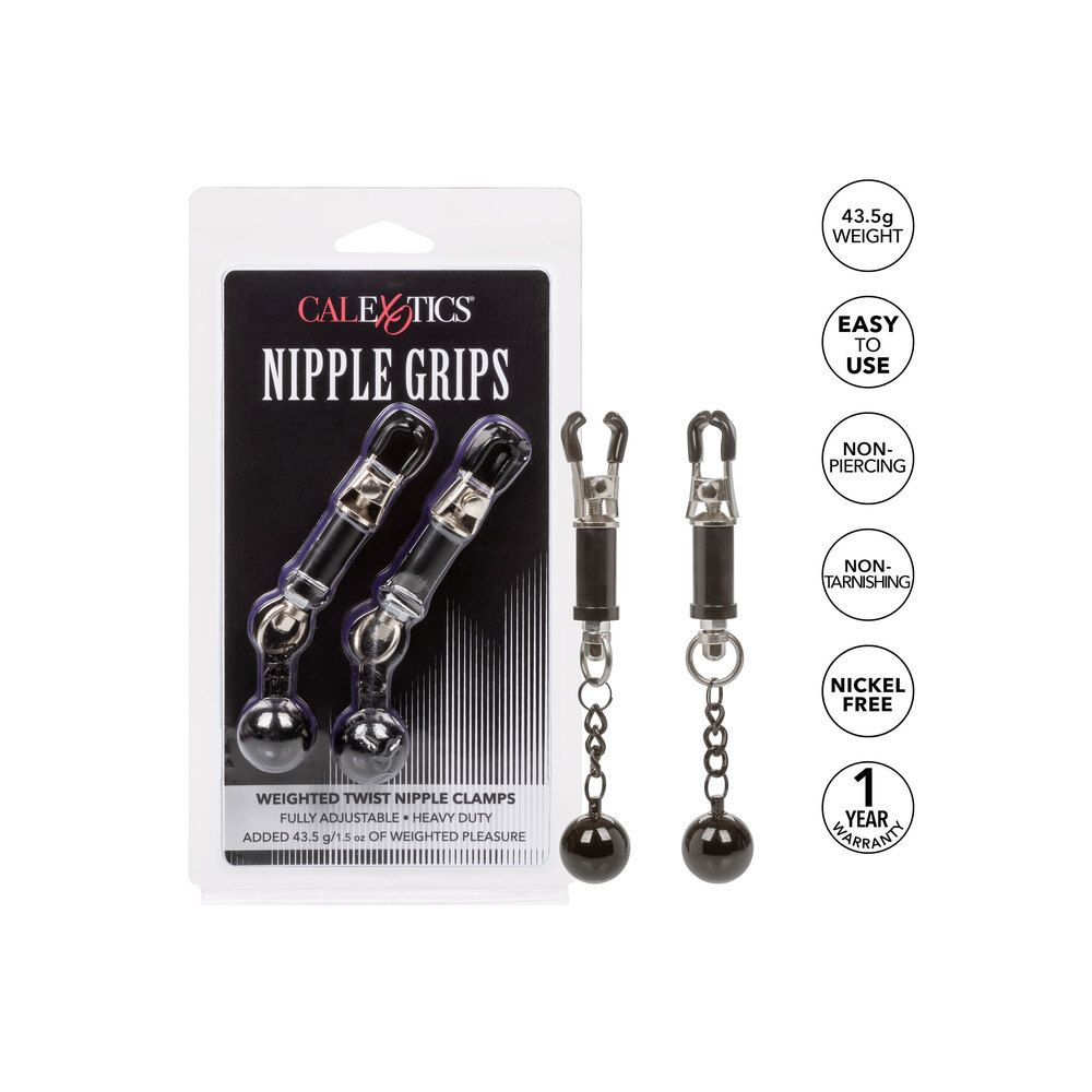 Blur the borders between pleasure and pain even further with the game-changing Nipple Grips Weighted Twist Nipple Clamps.Explore elevated sensation with 2 adjustable nipple clamps, unique twisting design, and swinging weight. Clamp the naughty clasps to your body and enjoy every rush of stimulation.43.5g/ 1.5oz weights for added stimulation