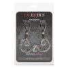 Includes 2 fully adjustable nipple adornments.Soft and comfortable cinch design.Sturdy high-quality chain for added sensuality.Non-piercing, non-tarnishing, nickel-free.Nickel-Free Iron, chain, beads.Silicone, loops.Crystal, jewels.