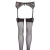 The perfect seducing set! Black lace suspender belt with adjustable suspenders. Simple black stockings included. 100% polyamide.
