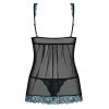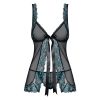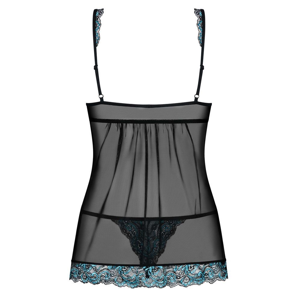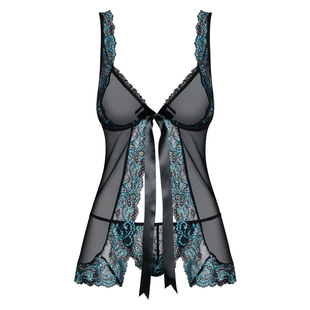 The transparent babydoll with lace on the bust and hem seduces with an open front. The matching string is included.