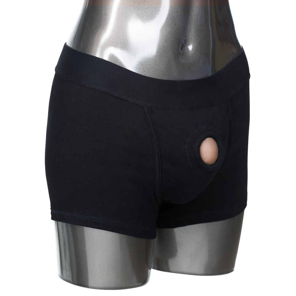 Black boxer brief harness, add your own dong or stimulator.Discreet 2 panel design to accommodate dual penetration Reinforced O ring stretches to accommodate most packers, dongs or probes Soft, stretchy and comfortable Comfortable soft lining Internal strap to secure your packer in place. Dildo not IncludedInternal pockets to add a favorite stimulator Not IncludedWashable 95 percent Cotton, 5 percent Spandex For women