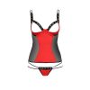 Black and red corset with decorative eyelets in the bra part and thong, which makes it unique. A sexy open bra and thongs on thin double straps show the qualities of a woman’s figure.