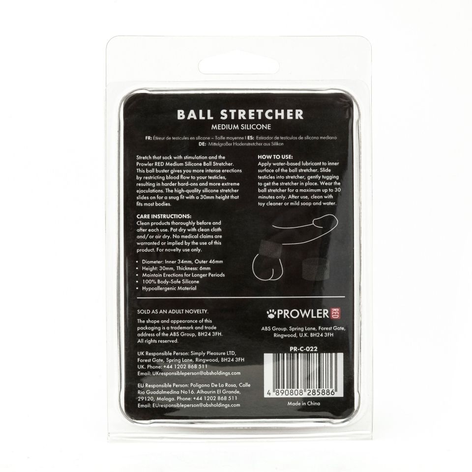 Stretch them low with the Prowler Red medium silicone ball stretcher.This ring provides longer, harder erections and more intense orgasms by restricting the flow of fluids to your testicles, bottling up your pleasure factory for an amplified explosion of ecstasy. The high-quality silicone stretcher slides on for a snug fit with a 20mm height that fits most bodies.How to usApply water-based lubricant to the inner surface of the ball stretcher. Slide testicles into a stretcher, gently tugging to get the stretcher in place. Wear the ball stretcher for a maximum of up to 30 minutes only.Inner diameter 34mmOuter diameter 46mmHeight 30mmThickness 6mm