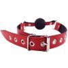 Leather, adjustable buckle strap with a black rubber ball gag. Gag 5.5 Inch Circumference