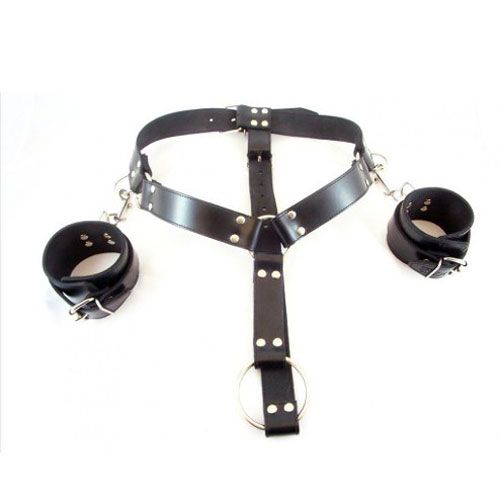 The black Leather waist harness is easily adjustable for the perfect fit. Includes a pair of detachable wrist cuffs with strap buckles and trigger hooks. This harness includes one metal O-ring enabling you to use the dildo of your choice or to use as a cock ring, up to 40mm circumference. Available in sizes S-XL.