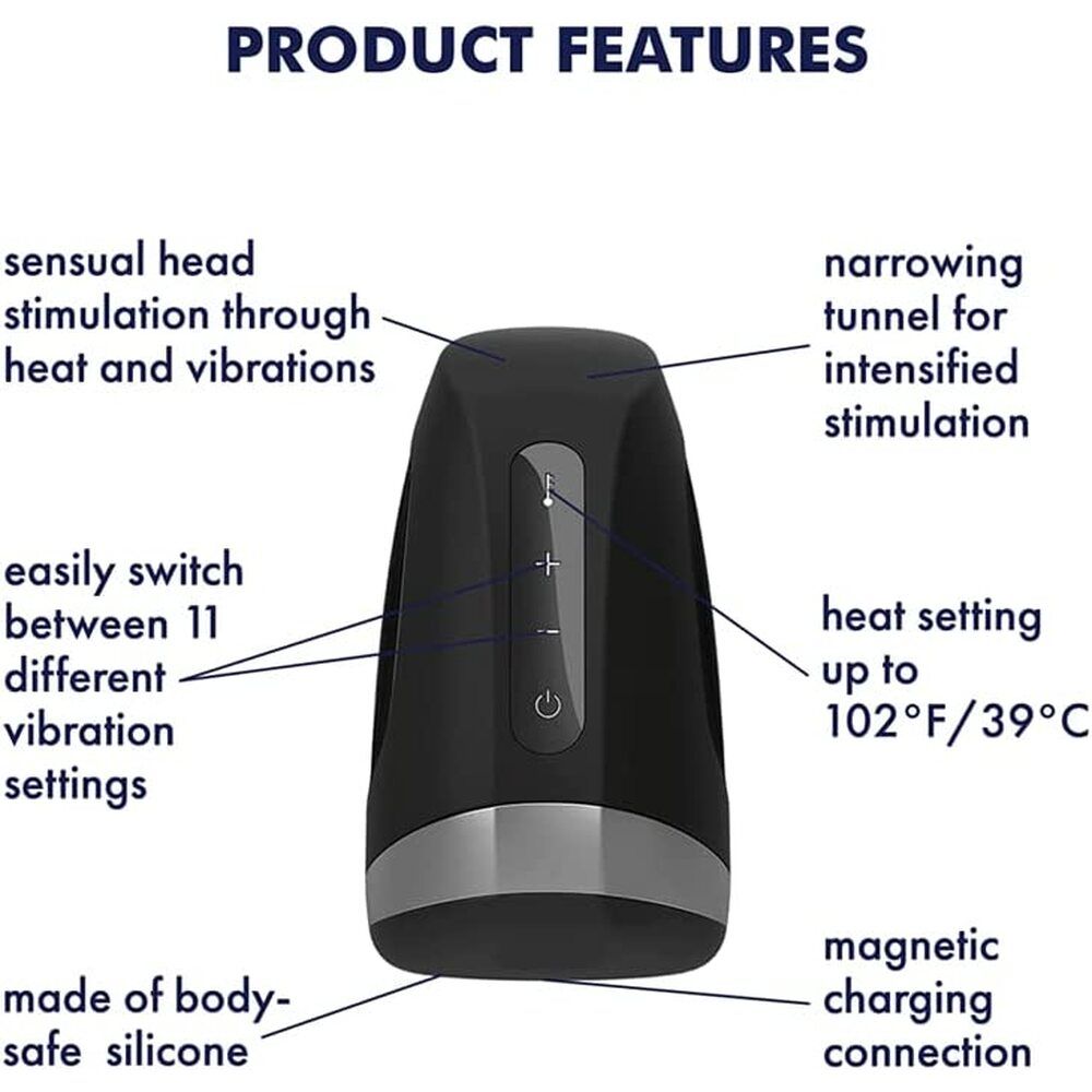 Are you looking for some hot hours of lust without complications? The Satisfyer Men Heat Vibration fulfils your wishes, when and where you want! This vibrating masturbator for the modern man is equipped with an innovative heat feature and makes your time alone a breathtakingly realistic experience. Enjoy the cosy warmth of this soft love tunnel and be driven to explosive climaxes at up to 40 degrees. The interaction of the exciting heating feature and the arousing, powerful vibrations provides exciting stimulation for your glans.The Men Heat Vibration combines a masculine design with a simple, intuitive operation using the on/off and plus and minus buttons you can control it comfortably with one hand, even when things get a little wild. Thanks to its wide opening, you can use the masturbator even when your penis is not erect and warm yourself up from 0 to 100 in no time at all.Lose yourself in your fantasies and be carried to the peak of pleasure with 11 different vibration levels.The Men Heat Vibration is waterproof and can give you that warm ecstasy you want even in the shower or bathtub. After use, the material made of delicate silicone and ABS plastic can be cleaned easily with lukewarm water and soap or a disinfecting sexual wellness device cleaner. The integrated batteries can be recharged using the enclosed magnetic USB charging cable. Sexual wellness for men has never been so easy to try it now and get the hot pleasure you deserve!
