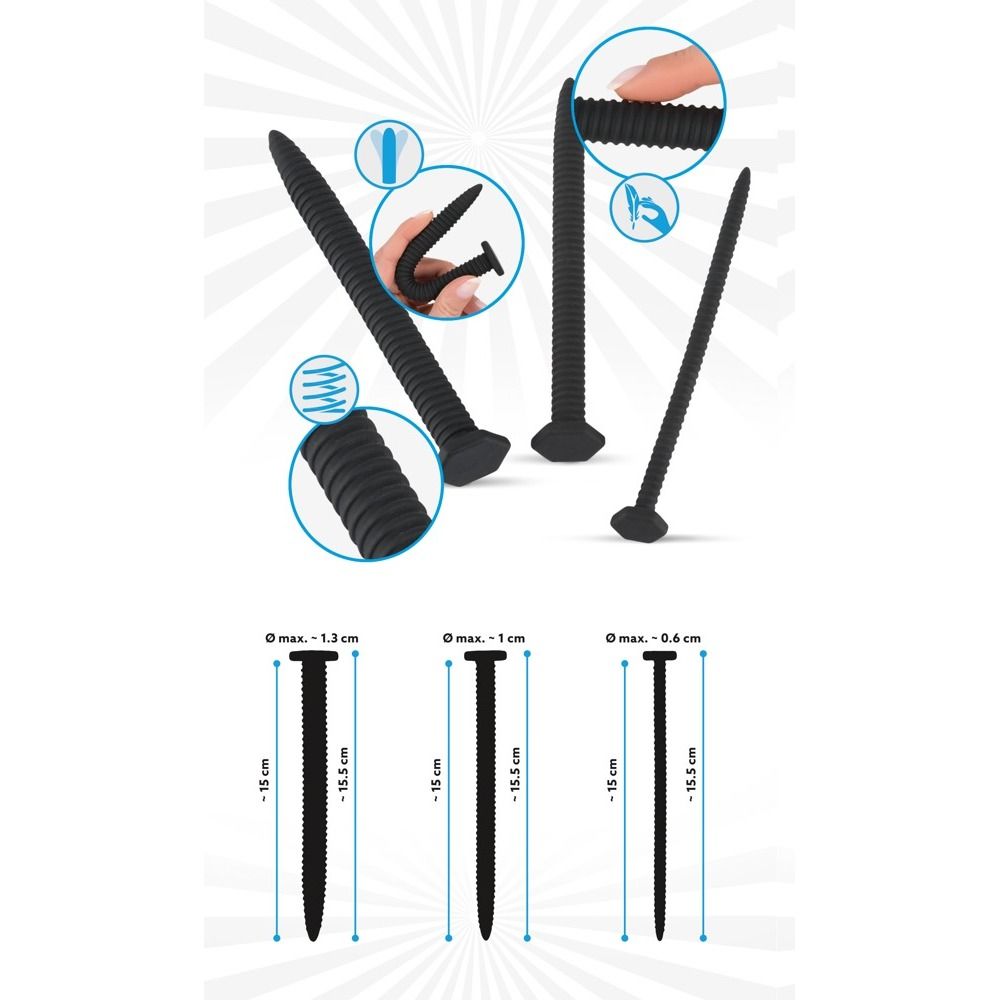 Dilators with 3 different diameters and weightsStimulating groovesWith a large headFor deep feelings in the urethra!3 extremely long dilators that are designed like screws in different sizes and with different weights. Perfect for beginners and experts of urethral stretching. The stimulating grooves provide a pleasant stimulation of the urethra and the larger head prevents them from slipping in too far.Complete length. 15.5 cm each, insertion depth. 15 cm each, dia 0.6 cm, 1 cm, 1.3. 7g, 15g, 23g. Silicone with a PU coating.