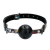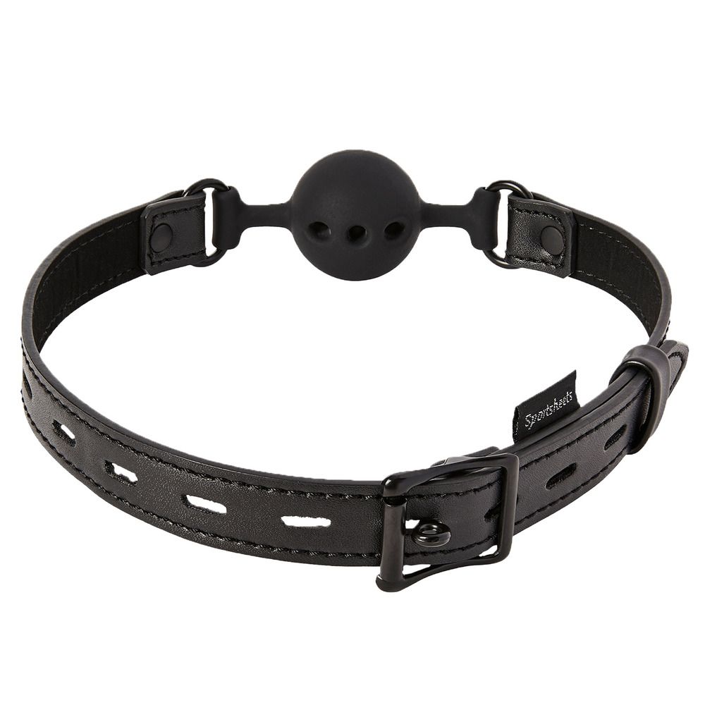 Punctured through the ball and aptly sized not to overwhelm this breathable gag allows your partner to explore the sensations of helplessness while still maintaining their ability to gasp and whimper with a bit of leeway. An excellent option for those looking for exciting new ways to enhance their erotic experience, the breathing holes make it easy to keep them comfortably at your command for longer sessions of tantalizing torment. The locking buckle ensures the safe and secure fastening of your naughty sub.Breathable silicone ball gagAdjusts to fit a wide range of sizesLocking buckleMaterial Nickel-Free Metal, Silicone, Polyurethane