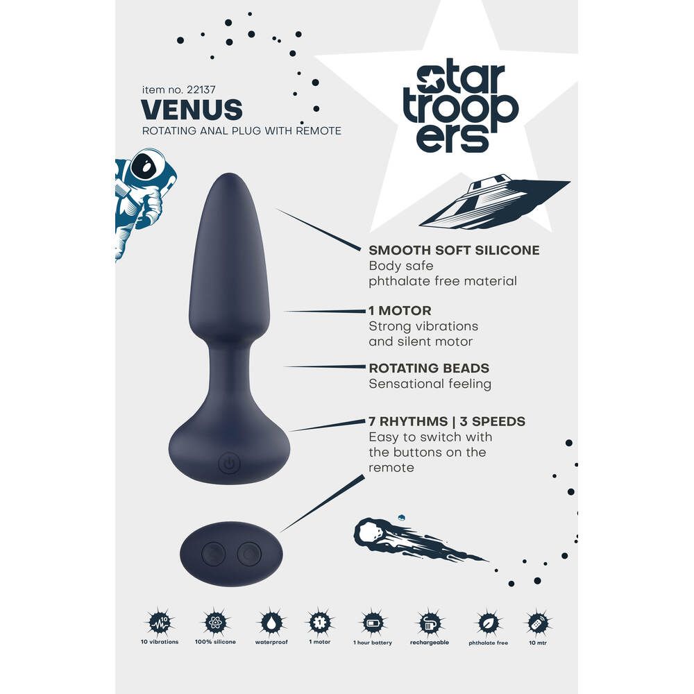 Venus will bring you wonderful pleasure because of the rotating beads that provide extraordinary anal sensations! This anal plug with rotating beads from the Startroopers range comes with a remote control for easy operation of the 7 rotation rhythms and 3 speeds with 2 buttons. You can also use the single button on the plug.Venus is made of soft and smooth silicone and ABS. The materials are phthalate-free and safe for the body. It has an IPX6 rating for water resistance. After a full charge, the Startroopers plug is ready for 60 minutes of stimulation. The toy has a waterproof charging hole and a USB pin cable is included. The remote is not waterproof. It includes a CR2032 battery.Rotating beads anal plug with wireless remote1 Motor10 Vibrations 7 rhythms, 3 speedsSingle button operation on plug2 Button operation with remoteRechargeable, USB pin cable includedCharging time 90 minutesRun time 60 minutesIPX6 water resistance plugThe Remote contains CR2032 battery, not waterproofMade of silicone and ABSBody-safe, phthalate-free