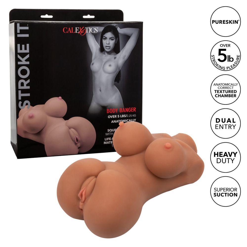 The Stroke It collection brings you the Body Banger, meant to thrill with a real-feel stroking experience.Dive deep into over 5 pounds of heavy-duty stroking pleasure with two realistic pleasure chambers, full-body design, and soft squeezable tits. No matter which one you choose, the ultra-tight textured and anatomically correct chambers create a wonderland of pleasure for any member willing to slip inside.The full-body stroker is great for anyone wanting a little more from their pleasure play with realistic plush-soft pink lips and amazing bouncy tits. Over 5 pounds of PureSkin material make for the truly heavy-duty, pounding pleasure you’ve been craving.PureSkin Thermoplastic Rubber is a super-soft, ultra-stretchy material with a unique, life-like feel delivering pure satisfaction in every stroke. This durable sleeve is easy-to-use, easy-to-clean and requires no special care. Prior to and after each use, wash the sleeve internally and externally with warm water and soap, then disinfect with Toy Cleaner.