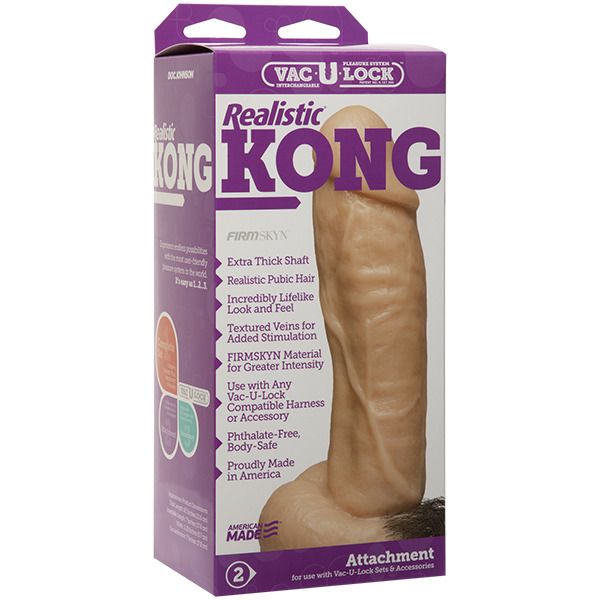 Can you take on the king of cocks? Unleash the animal inside with the Realistic Kong, featuring a long, thick shaft, lifelike veins, and a thick bush of pubic hair above the firm, squeezable balls.The 8.5-inch Realistic Kong can be used with any Vac-U-Lock compatible harness or accessory for endless versatility and variety.FIRMSKYN Material for Greater IntensityExtra Thick ShaftRealistic Pubic HairIncredibly Lifelike Look and FeelTextured Veins for Added StimulationUse with Any Vac-U-Lock Compatible Harness or AccessoryPhthalate-Free, Body-SafeProudly Made in America