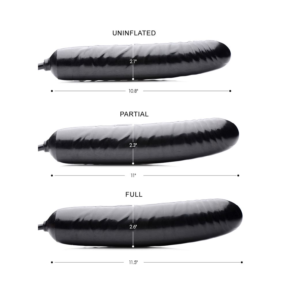 A whopping 11 inches of black rubber dildo that is able to inflate to give about a 8.25 inch circumference. Just squeeze the bulb to inflate and use the quick release to deflate.