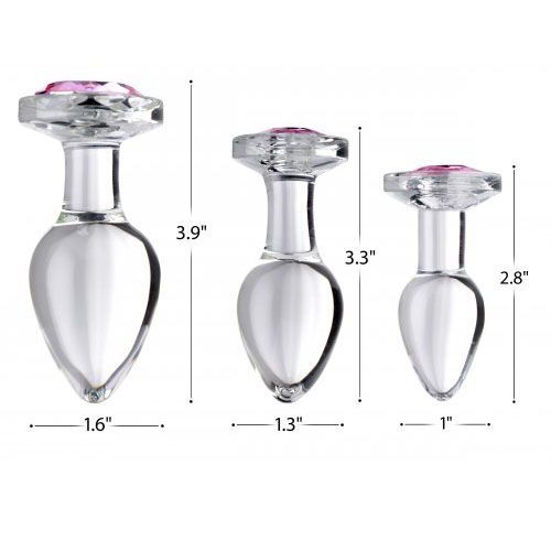 Adorn your derriere with this set of dazzling pink gems! These glassy Booty Sparks anal plugs are crystal clear and super smooth to provide a solid texture just for your backdoor. Perfect for warming up your hole for further pleasure, or as a standalone anal toy – the rigid body and super smooth surface presses firmly against your walls for an incredibly satisfying squeeze!Simply lube up and insert to make that booty sparkle! Enhance your ass with a bright pink gem to entice your lover and prep your booty for some rougher play. The glass material is naturally hygienic and body-safe so you can play worry-free. Resistant to odours and easy to clean before and after use, these glass gems are a staple to any toy collection.Perfect for temperature play – heat or chill these glass plugs to provide an extra layer of pleasure!Smooth and tapered for easy and comfortable entry and compatible with all lubricants so you can play your way. Upgrade from small to medium to large when you think your booty can handle it!Small Measurements Overall length 2.8 inches, insertable length 2.3 inches, diameter of widest point 1 inchMedium Measurements Overall length 3.3 inches, insertable length 2.7 inches, diameter at widest point 1.3 inchesLarge Measurements Overall length 3.9 inches, insertable length 3.1 inches, diameter at widest point 1.6 inches